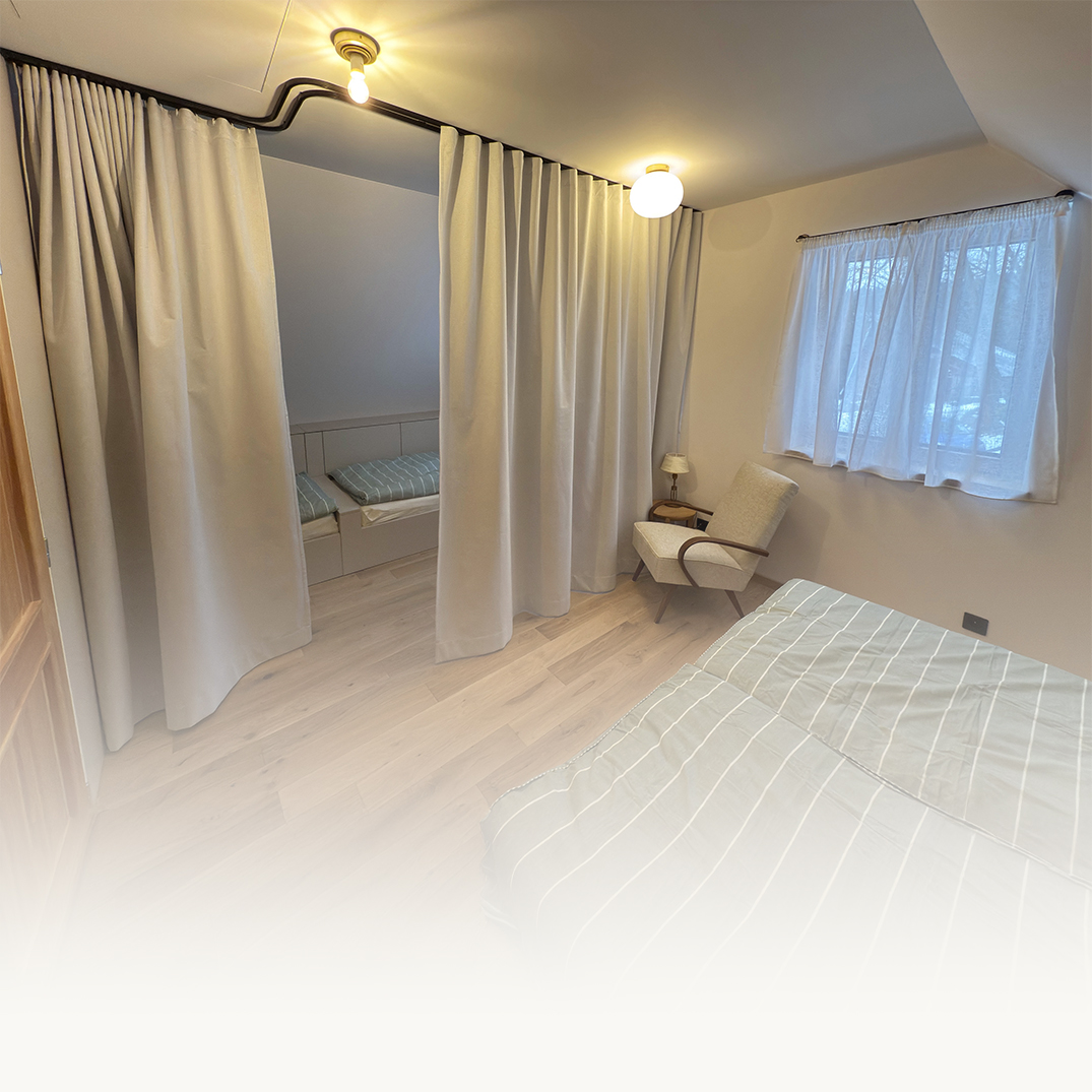 V rámci realizace jsme se postarali o záclony a zastínění, které nejen splňují praktické požadavky, ale zároveň dokonale ladí s přírodním rázem interiéru.